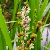 Le rubanier (sparganium erectum), une plante émergente qui favorise la filtration naturelle de l’eau.