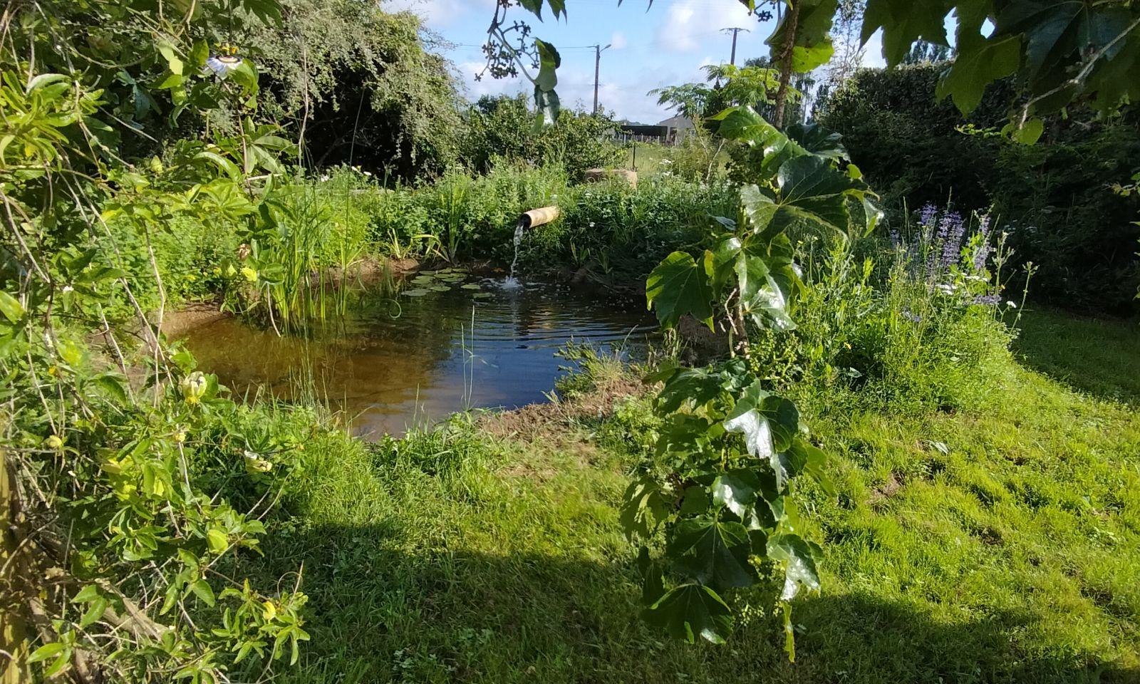 Au centre de la mare, un bambou creux, habilement intégré, donne vie à un jet d’eau naturel qui semble naître de la terre elle-même. Ce dispositif écologique, alimenté par une pompe solaire, apporte mouvement et oxygénation sans perturber l’équilibre du milieu.