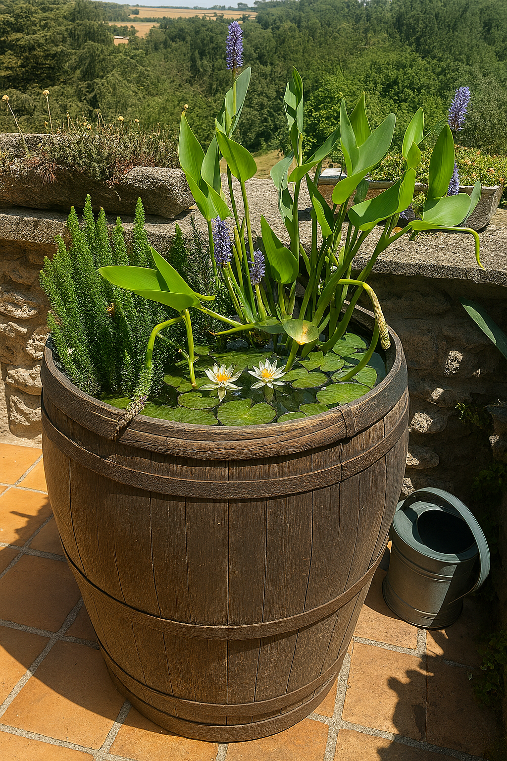 Plongez dans la sérénité grâce à ce tonneau aménagé en petit jardin d’eau, parfait pour sublimer votre terrasse ou votre intérieur !