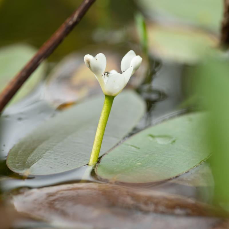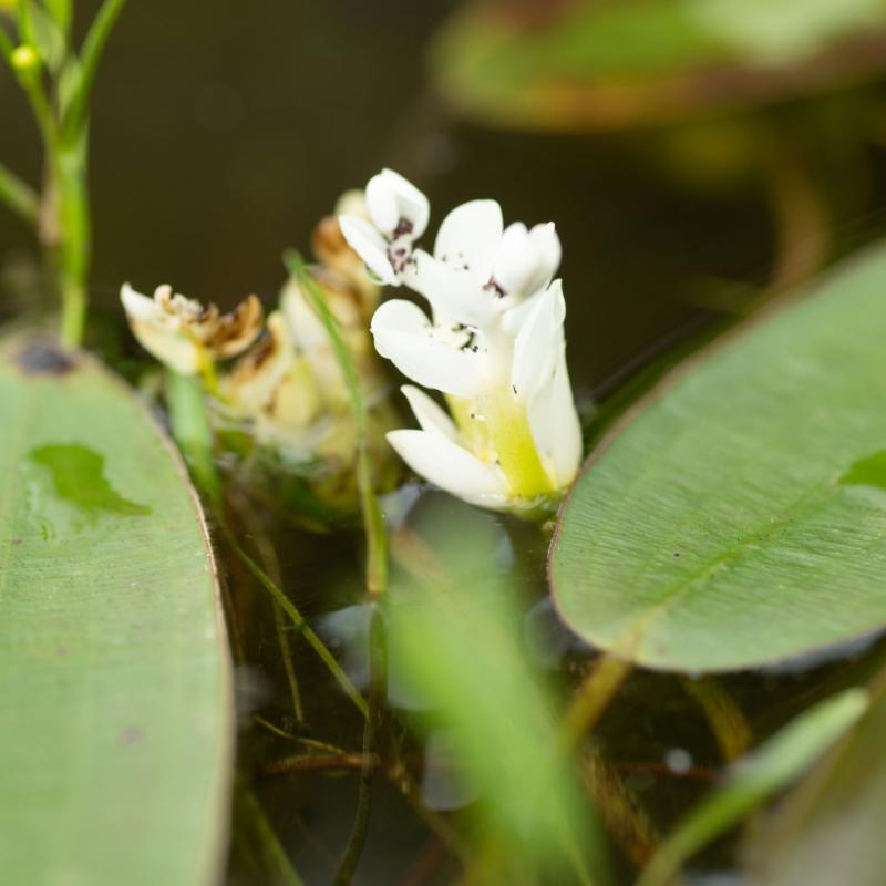 Feuillage élégant : Ses feuilles flottantes vert foncé, oblongues et lustrées (jusqu'à 40 cm de long), forment des rosettes immergées puis émergent en surface. Parfois tachetées de pourpre, elles persistent même l'hiver.
