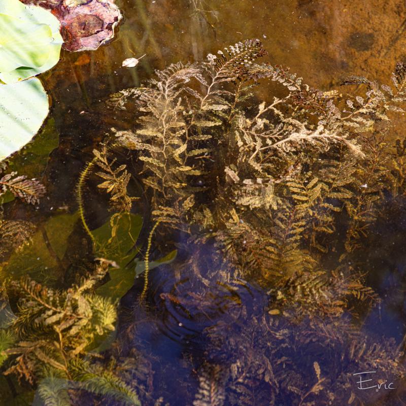 Feuillage distinctif : Ses feuilles submergées, linéaires à oblongues (3-8 cm de long), aux bords ondulés et dentelés, forment un herbier dense vert bronze à brun-rouge selon la saison. Les tiges aplaties et ramifiées s’étendent jusqu’à 1,5 m de longueur.
